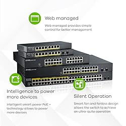 - The Zyxel GS1900 Series offers 8/10/16/24/48-port GbE Smart Managed Switch with Gigabit speed and essential managing functions that bring flexibility and connectivity to your business network. The GS1900 Series provides power-saving functions and full IPv6 support to ensure your network to be ready for future expansions. In addition, the PoE models support the IEEE 802.3at providing a maximum of 30 watts per port. The smart fan and fanless designs of the GS1900 Series empower your networks with silent operation in your office. Benefits | Experience whisper-silent operations The GS1900 Series includes fanless and built-in smart fan models. The smart fan is designed to automatically adjust speeds based on the device temperature, offering near silence while the GS1900 Series is in operation. Ideal for your office environment as you can barely notice the GS1900 series in operation. Versatility and flexibility for different needs The complete Zyxel GS1900 Series has an essential portfolio of 8/10/16/24/48- port compact desktop and rackmount size with GbE connectivity. All models support multiple deployment methods to fulfill the needs for small offices and meeting room environments such as wall, under table or desktop mounting and rackmount options. It's now quick and effortless to enjoy the high-speed business network applications without a hitch. Additionally, the GS1900-10HP/ 24/24HPv2/48/48HPv2 is equipped with 2 extra SFP slots to provide 100M and GbE speeds for long-distance deployments. Intelligence to power more devices (PoE models) PoE models of GS1900 Series support IEEE 802.3at providing a maximum of 30 W per port features with default PoE consumption mode to deliver only the actual power required by your networked devices, reserves the rest and optimizes its power budget. That means a single switch can power more APs, IP cameras and VoIP phones, ensuring a better ROI for your business. Easy, intuitive wizard set up For small businesses that want to manage their infrastructure in advance, the Zyxel GS1900 Series comes with a friendly built-in Web-based browser for simple configuration and management. Moreover, the friendly step-by-step intuitive wizard helps avoiding multiple complicated configuration pages for quick set up with few clicks in the matter of minutes. To guide the users from start-up, VLAN, Guest VLAN to QoS setting, the Zyxel Series offers four most common steps and combines them into a quick and easy setup wizard; which does not just save deployment time and efforts, but is also helpful especially for the non-IT staff.