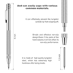 - Ceramic, glass, metal 5-inch scriber This scriber can easily leave a mark on various materials for you, which will help you in your later work. The scriber can also be used as a small engraving pen when you are in DIY Useful hand tools for any professional craftsman and DIY enthusiast! Specifications: Aluminum body structure Deep knurling with slip resistant design Color: silver Size 5“ Package included: 2 high-quality aluminum scribers and 10 high-quality tungsten carbide spare bits Each needle tip is equipped with a silicone protective sleeve to prevent sharp parts from scratching