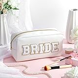 - Features: The PU leather wedding small makeup bags are exquisite in workmanship and are embroidered with words [Bride] and [Groom], fluffy and comfortable, and the zipper is made of gold plated alloy, adding a more modern touch. The bride embroidered letter patch white makeup bags conform to the aesthetic standards of most people, so you can send them as gifts to your lover, family member, friend, neighbor and colleague on weddings and formal parties. Specifications: Material: mainly PU leather and gold plated alloy Color: mainly white and black Size: approx. 2.99 x 10 x 5 inches/ 7.6 x 25.4 x 12.7 cm Package includes: 2 x Wedding cosmetic bags for women Notes: Manual measurement, please allow slight errors on size. The color may exist a slight difference due to different screen displays.