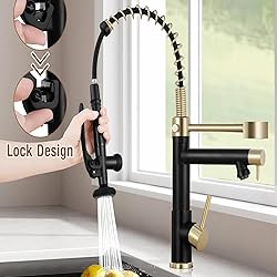 VIDEC Smart Kitchen Faucet, 3 Modes Pull Down Sprayer, LED Temperature Control, Ceramic Valve,360-Degree Rotation,1 or 3 Hole Deck Plate, Double Spout. 10-Year Warranty. (KW-29RK, Gold/Black)