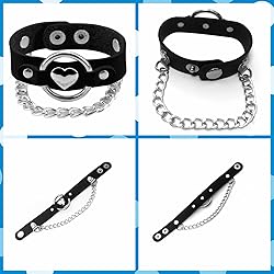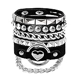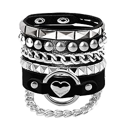 Material:Premium Soft Faux Leather + Metal Alloy + Snap Button Clasp. Size Detail:Fit for wrist line:7-8 inches,total Length is about 8.5inches. Design:Handmade with square pyramid,round studded,metal chains,spikes,heart pendant elements,built to classic punk,stylish,cool and sweet jewelry set for 80's 90's rock star costumes. Scenes:Suitable for concert,birthday parties,proms,rave festival,theme party,all saints eve,or as fancy looks. Package:3 pcs black leather studded bracelets,packed in a cute opp translucent bag.