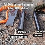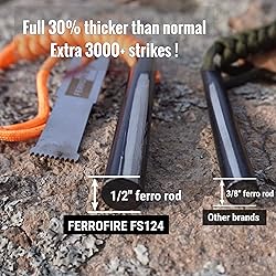 - Never Be Caught Without a Reliable Fire! The FERROFIRE FS124 Heavy-Duty Ferro Rod Fire Starter achieves the ideal balance of rugged performance and lightweight portability. Engineered with a massive 1/2-inch thick ferrocerium rod and magnesium core, it generates 3,000°F sparks capable of igniting even damp tinder effortlessly. Weighing just 3.5 ounces, it is light enough for any pack yet powerful enough for extreme conditions. This complete survival kit includes a multi-edged carbon steel striker for consistent sparks and a high-visibility paracord lanyard that doubles as a 5-foot survival tool. With a lifespan of 18,000+ strikes, the FS124 offers unparalleled windproof and waterproof reliability—whether for camping, hiking, bug-out bags, or emergency preparedness. Compact, dependable, and built to last, the FS124 ensures you carry maximum fire-making capability with minimal weight. Stay prepared, stay light, and master fire anywhere.