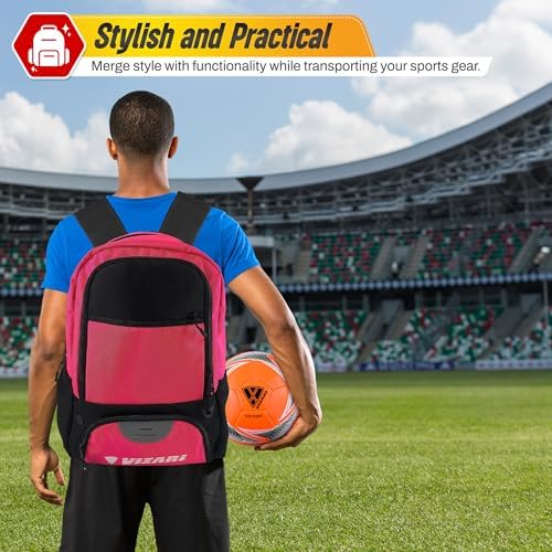 Vizari Soccer Backpack Soccer Bag | Water resistant Durable Equipment Bag for Football, Basketball, Volleyball | Cleats and Ball Compartment - Red,Blue,Pink,Black