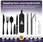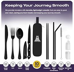 ✅ Providing a fancy dine-in experience anywhere around the globe: This travel utensils Set with Case has 10 portable utensils including a spoon, fork, knife, butter knife, chopsticks, 2 straws, 2 salt shakers, and a straw cleaner, Camping utensils set is Portable, lightweight, and durable travel cutlery for outdoor adventures. ✅ Super Handy to Carry: The 9.8x2.6" case makes it a portable travel utensil set. Lightweight and water-resistant, this reusable silverware set with case is perfect for camping, trips, picnics, hiking, eskys, caravans, scouts, and more. The travel cutlery case stabilizes the utensils, preventing noise on the road. ✅ Say No To Single Use Plastic: Our reusable utensils set with case helps protect the planet from global warming. Use this durable silverware case travel set for an extended period, reducing single-use plastic waste. ✅ Easy To Clean: Taplord's silverware camping set with case is waterproof, dishwasher safe, and stainless steel. Hygienic and perfect for daily use, this portable utensils set with case simplifies cleaning. ✅ Detail Oriented: Travel cutlery set with a simple appearance, smooth edges, stainless steel, lightweight yet stylish. Any style of kitchen can be equipped with these travel utensils and cases to meet the basic dining requirements of every consumer. Traveling with it is hassle-free, portable, versatile, and easy to clean