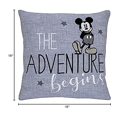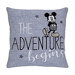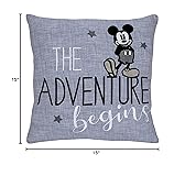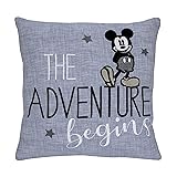 - The Adventure Begins! This 15" x 15" blue pillow features a faux chambray look and has an embroidered script reading THE ADVENTURE BEGINS. The front also features a large Mickey Mouse applique and embroidered stars. Made from a cotton blend. A wonderful decorative accent for any nursery or toddler room! Spot clean only.