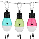 Assorted Color: Set of three different-colored camping lights for a unique and vibrant camping decor. The sleek and modern design integrates seamlessly with any camping decor. Perfect gift for outdoor enthusiasts and camping enthusiasts alike. 150 Lumens & 3 Lighting Modes: Exquisite bulb-shaped lights have 3 beam modes (High/Low/Strobe) which provide a maximum of 150 lumens of brightness. Select your preferred mode according to your demand, suitable for camping, hiking, backpacking, fishing, etc. outdoor use, used as decorative indoor lights, night lights. Compact & Lightweight: Palm-sized(4.75X 2inch, 2.3 oz) portable led tent light, takes up very little room, easy to carry and grip for kids. Snap Hook Design: With a handy hanging hook on the top, it can be used as a hands-free flashlight or hanging camping tent light. This lamp can be hung anywhere there is a hook or a strap. Closed hook to ensure that the camping light does not fall while suspended. Rechargeable: Set includes 3 Type-C and USB cables. They can be fully recharged via the USB cable for around 45 minutes, then one light can last 2 hours in high mode.