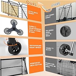 【Upgraded Base & Sturdy Construction】Made of high quality stainless steel with black painted surface, our shopping cart has better performance in terms of rust resistance, corrosion resistance and scratch resistance. The bottom adopts an upgraded mesh bottom with rods, frame is thick and sturdy, which makes this shopping cart not only prevents small items from falling, but also has a strong load-bearing capacity. Whether it is heavier water or boxes, this shopping cart can be easily carried. 【Large Size Shopping Cart & Waterproof Liner】Larger capacity storage desigen with basket size : 16.5*13.97*19.3 inch , this shopping cart can meet the needs of 99% of households. The included black liner is made of 600D Oxford cloth with PVC coating, which is durable and waterproof, it can effectively prevent small items from falling and protect your privacy. 【Bigger Rubber Wheels & Better Maneuverability】Our shopping cart uses hard rubber wheels, and the wheels are larger than normal shopping cart wheels, the front wheel is 4.3" in diameter, can rotate 360° degrees, easy to change direction, the rear wheel is 7.3" in diameter, whether it is on flat surfaces or in cracks, the shopping cart glides effortlessly, making it an excellent choice for hauling groceries and protecting your joints. 【Easy to Assemble & Foldable Design】This upgraded Grocery cart is compact and easy to assemble, you don't need to prepare extra tools, it can be assembled within 10 minutes with reference to our assembly video and instructions. When not in use, the grocery cart can be folded for storage to saving space. 【WHAT YOU WILL GET】 You will get one shopping cart frame, one waterproof liner,two front wheel,two rear wheel and one box of assembly parts. RXUJYC offer 6 years product warran-ty and life-time technical support . All accessories are replaceable for fr-ee. Your satisfaction is always our first aim.