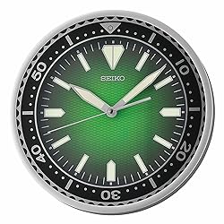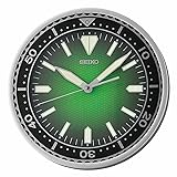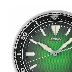 Designed for the sports lover and adventure seeker; stylish wall clock in metallic green with silver frame LumiBrite tipped hour and minute hands along with hour indicators just like classic Seiko watches The quiet sweep second hand continuously glides around the clock, eliminating annoying ticking sound Powered by 1 AA battery (included); dimensions are 11.8 X 11.8 X 1.8 inches Convenient molded triangle on back for easy hanging and backed by a manufacturer's one year warranty