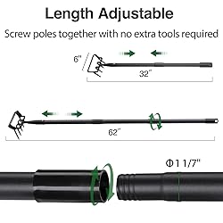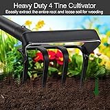 Heavy Duty 4 Tine hand cultivator garden tool digs down and extracts the entire root for weeding flower bed that is overgrown, hard desert dirt weed removal, ditching, seeding vegetables even in compacted ground. Stirrup hoe carbon steel blade head with sharp end makes garden hoe easier to either scrape the top layer of dirt to get the weeds cut or get this tool under the surface of the soil to rip them out. Thickened 1 1/7” diameter stainless steel handle is sturdy, light weight and very handy in the garden for regular yard duty without snaps. Long Handle is adjustable to be 32 and 62 inch which is convenient to use when standing or sitting down and handy gardening tools to just keep by the backdoor, as well. 5 mins to assemble weeder by attaching weeding hoe to the topper pole with the bolt provided and then screwing poles together with no extra tools required.
