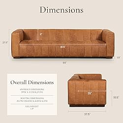 Modern design with sculpted ease: The Canale 99" sofa is thoughtfully designed with clean lines, soft edges, and a calming silhouette that adapts easily to modern spaces. Whether styled in a loft or a bright living room, it brings understated sophistication without shouting for attention. Its elongated profile makes a strong yet approachable statement, anchoring your space with comfort and presence. Textured performance fabric built to last: Wrapped in soft but durable performance fabric, Canale is made to handle everyday life. Its subtle texture and cognac tan finish give it character while resisting stains and fading. Whether it’s kids, pets, or casual lounging, this is a sofa that holds its own and keeps looking good while doing it. Designed for real homes and real routines. Comfort that’s structured, not saggy: The high-density foam cushions and fiber fill strike the right balance between support and softness. The deep seats invite you in, while the solid structure keeps its shape over time. Underneath, reinforced webbing and a kiln-dried hardwood frame add long-term durability, so your sofa stays supportive and stylish, no matter how often you use it. Crafted details that speak quietly: From the crisp piping to the tapered legs, every detail of Canale is considered. The silhouette is low-slung and refined, with design flourishes that enhance without overwhelming. It’s a piece that complements your decor and adds polish to your space, whether styled alone or with layered textures and tones around it. Simple setup, built to stay: Canale ships mostly assembled—just attach the legs and it’s ready to take its place. It’s a sofa made for those who want a design-forward piece without the fuss. Whether you're refreshing a single room or designing a whole space, it’s the kind of furniture that doesn’t just fit in, it elevates everything around it.