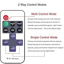 Single Color LED Strip Lights RF Remote Control - Works with 5050 3528 5630 3014 Single Color LED Strip Lights. Remote turn on/off, dim the brightness and change dynamic flashing mode and speed. LED Light Dimmer Switch - The LED Remote Controller supports 10 levels brightness adajustment, also with 25% 50% 100% quick brightness change buttons. 8 dynamic modes and 10 levels dynamic speed adjustment. It also built- in automatic shutdown memory function. Wide Application - Simple add this LED controller to remote control your LED lamps, point-source light, flexible strip light, wall washer light, glass curtain wall light and so on, pecfect for DJs, Musicians, Parties and More. Working Voltage - DC 12V-24V. Max Current: 12A. 11 key RF Remote control with 433MHz Frequency. Remote distance: 15m at open area. Please note power adapter is not included. Single Control & Multi Control - One remote is able to control multi receivers by default. If you want separate control, restart the power of the receiver, and within 5 seconds, press and hold "SPEED-" and "SPEED+" buttons at the same time for about 10 seconds until lights flash, now the frequency will be changed and only this remote can control this receiver.
