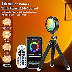 【Romantic Sunset Atmosphere Lamp with Countless Colors and 4 Modes】HugoMova sunset projector lamp ambient light equipped with 16 colors RGB led, wireless remote control and APP control, and Flash/ Strobe/ Fade/ Smooth effects,thicker crystal lens, wider luminous angle, it can create a colorful and romantic environment.You can change the light effect according to different scenes, meet all your needs. Perfect for studio, ambient light, background dimming, personal/objects/scenes photography, etc. 【Smart APP and Remote Control Sunset Lamp】The sunset light has a button controller, you can choose your favorite color or brightness. The sunset light projector has a smarter design, with APP, you can select the scene and brightness through the free APP. Super convenient and versatile! The lights can flicker to the music when you select Music mode on the APP! With it, you can create a dynamic party atmosphere! 【360 Degrees Rotated Sunset Light with Tripod】HugoMova sunset light can be rotated 360 degrees so that you can freely adjust the angle. Sunset can be projected onto the wall and ceiling, to bring better effects to your room bedroom bars, cafes, party, decorative lighting, space ambient light, etc. 【Not Only 16 Colors】 This APP controled multi-color sunset lamp projector has a variety of colors, 16 colors can be set through remote control and countless colors by the APP control. Nice Christmas gift, New Year's gift, Thanksgiving present. 【Stable and Durable】Made of aluminum alloy, PVC and LED lights. The sunlight lamp with multiple colors is always stable thanks to the octopus design. The energy-efficient, glare-free LED lamp has a long service life.7*24H customer service, if the product you received is broken or dissatisfied please feel free to contact us though amazon.Enjoy the fun!
