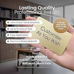 Custom solid brass plate - 1”x3”, 1”x4”, 2”x4”, 2”x6”, 2”x8”,3”x6” (50 characters per line max – the more characters per line, the smaller the text will be) All text will be centered. If you only need two lines of text, use lines 1 and 2 and we will center all text. Your choice of commercial grade adhesive backing (already attached for easy mounting) or Blank. Your choice of squared, rounded, or notched corners. You may also add holes in the center of each end. (We do not provide the screws or nails for attachments) If you choose this option there will be no tape on the back. Our plates are great for personalization needs such as: Flag Case, Awards, Taxidermy, Trophy, Memorial, Pet Memorial, Boy Scouts, Cub Scouts, Arrow of Light, Fantasy Football, Christmas, Birthday, Anniversary, Wedding, School Projects, Church, Club, Identification tags, Employee, Recognition Plaques, etc Select square, rounded, or notched corners for a tailored finish. Optional center holes let you attach with screws or nails (hardware not included). Blank-back option available if you prefer adding your own adhesive. Ideal for trophies, flag cases, memorials, scout awards, and more. Up to 50 characters per line—plenty of space for names, dates, or messages.