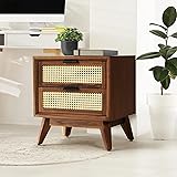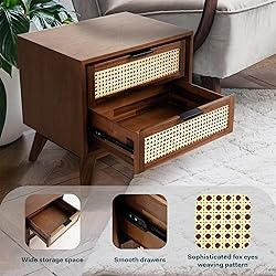 STUNNING RATTAN NIGHTSTAND: The timeless design of our mid century modern nightstand can be easily incorporated into any decor; The solid wood nightstand is available in two elegant color options, adding a touch of class to your home QUALITY RATTAN NIGHTSTAND: The solid wood nightstand offers a durable acacia laminated surface; More stability is provided by the solid acacia wood legs with adjustable levelers. You can buy rattan nightstand set of 2 to replace a dresser in the bedroom UNDER 10 MINUTES ASSEMBLE: The fully assemble nightstand with drawer comes 95% pre-assembled, including all parts, hardware, and instructions in a carton box; Just put on four legs, and your boho nightstand are ready MULTIFUNCTIONAL SOLID WOOD BOHO SIDE TABLE: Our mid century side table is both fashionable and functional; The rattan side table can meet your storage needs with its spacious tabletop; Two rattan drawers of the bed side table have a wide storage space POST PURCHASE SERVICE: The nightstand brown is offered with a 30 day return and 1 year warranty; Our dedicated customer service team is available 24/7 to support your shopping experience