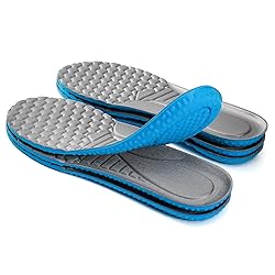- XINIFOOT Elastic Shock Absorbing Insoles for Men and WomenFeatures:1. Shock absorption ensures reduction of muscle fatigue in feet & legs.2. Breathable material, ideal for Walkers, Runners, Joggers, Sports Training and those seeking additional comfort and cushioning.3. There are a lot of salient point on shoe insole, it can massage your feet. At the same time it is very soft and will not hurt the soles of the feet. Enhance your walking experience with these comfort insoles.4. Cuttable Size: This insole can be freely cut according to shoe width, tailor your shoes to the width of the shoe and don't worry about fitting.5. For all of you: The shoe insoles are available all year round. At the same time, the insoles can be for running shoes, leather shoes, for climbing boot, and Work boots or for casual shoes.SIZE Suggestion:Size Medium fits US 4 - 8.5/ EU 35-40 for Women.Size Large fits US 8 -12 / EU 41-45 for Men .Thickness: 0.9cm
