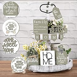 Package includes: You will receive 11 pieces of spring tiered tray decorations, each piece is cute and elegant, suitable for decorating your tiered tray in daily life; Please note that the tiered tray is not included Sturdy and Reliable: these rustic farmhouse sage green table decorations are made of quality wood, with good stability, smooth surface without burrs, comfortable touch, reliable use, no deformation, good shape, and can be kept in good condition for a long time Farmhouse style: The wooden tiered tray is full of rustic farmhouse atmosphere, beautifully designed, with fresh colors, in line with the theme of the festive atmosphere, bringing you a pleasant visual enjoyment Versatile and Decorative: In addition to decorating your tiered trays, our farmhouse tiered tray decorations can also be displayed on dining tables, fireplaces, cabinets, shelves, or you can use hooks and ropes to hang them on walls, windows, doors, trees and other places Housewarming Gifts: These home decorations can be made as beautiful and charming gifts to give to your family, friends, relatives, neighbors and coworkers on birthdays, housewarmings and other appropriate occasions, which will bring them a sense of warmth and comfort