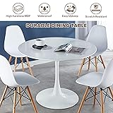 5-Piece Dining Table Set: This set comfortably seats 2-4 guests, which includes a round dining table and 4 chairs. The tulip table with solid wood leg chairs makes the dining set a versatile addition to kitchens, living rooms,offices and conference rooms, adding mid-century modern to living space Space Saving Friendly: Mid-century modern round dining table set for 4 features a 42" tulip table with pedestal base, and the chairs slide under the table to maximize floor space, perfect for studio apartments small kitchens. Circular design allows everyone to sit around the table,making it easy for family and friends to fun conversation Sturdy & Durable: The dining table is made of engineered wood and metal with a water-resistant and scratch-resistant surface to ensure long-lasting use. Heavy-duty metal base ensures stability and durability without wobbling. PP plastic chairs with solid beech legs are comfortable and easy to maintain. The table can load up to 220 lbs and each chair can load up to 240 lbs Wide Range of Applications: The table and chairs dining set can be used in many spaces - compact breakfast nooks, coffee, office reception tables, and even exhibit tables! The clean lines and exquisite wood details will make this round dining table set for 4 a great addition to any space 2-Pack Delivery & Easy Maintain: This round table and chair set arrives in 2 carefully packaged boxes for secure transit. This small dining room table set is ready to tackle each day throws its way with its stain, scratch resistant properties