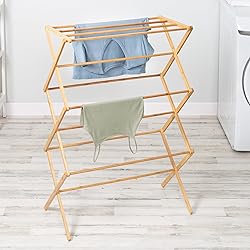 - Remove wear and tear on your favorite clothing items by air-drying them on this collapsible bamboo drying rack. With 25 linear feet of drying space across multiple tiers, it provides plenty of room for vintage tees, jeans, sweaters, towels, and delicates. The multi-level design also makes it an ideal sweater drying rack, helping knits keep their shape without stretching. Skip bulky electric dryers and save on energy costs with this foldable clothes drying rack. Whether you live in a small living space, appartment, dorm or RB, air-drying your clothes helps prevent fading and shrinking while reducing electricity use. Plus, when not in use, it collapses flat for compact, space-saving storage. Designed for indoor and outdoor use, this collapsible drying rack for laundry is made from durable bamboo. Its natural bamboo finish adds a stylish touch to any laundry room, balcony, or patio, making it both functional and aesthetically pleasing. Unlike a electric dryer, this sustainable alternative extends the life of your clothes. For those who love a laundry area that looks great, this stunning bamboo clothing rack is not only easy on the eyes, but easy on the earth, too.