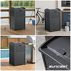 - Elevate your outdoor space while maintaining cleanliness with the Suncast 33 Outdoor Wicker Trash Can for Patio. Featuring a decorative wicker-style design, this porch trash can blends seamlessly into any patio, deck, or garden area, offering an attractive solution for waste management. Its 33-gallon capacity works with standard 30-gallon garbage bags, ensuring convenient and hassle-free usage. The hinged lid with a secure latch keeps garbage contained and deters pests, while its durable, weather-resistant resin construction provides protection against fading, cracking, and water damage. Measuring 16" W x 15.75" D x 31.7" H, this compact trash can delivers substantial storage without taking up too much space, making it an ideal addition to any outdoor setting.