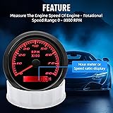 - Features: RPM Tachometer Support : Car /Truck/ Boat /Diesel Generator Engine /Gasoline Engine Waterproof:IP 67 Excellent anti-fogging function; 316 Stainless steel bezel with curved glass; With curved glass( with anti-fog function). (red,yellow,orange,green,blue,purple,white),customers can adjust any color that you like Specification: Size:85mm Engine hours: 0.0-99999.9H Working voltage: 9-32VDC Waterproof and dustproof grade IP67. Working current: <120mA Working temperature: -30-70℃ Storage temperature: -40-85℃ Backlight :7 Color backlight Indicating Range: 0~8000 RPM