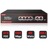[6 Ports PoE Swich]: This ethernet switch includes 4 gigabit PoE ports, 2 Gigabit uplink ports, support 1000Mbps POE and uplink connection, excellent data transmission performance. Unmanaged PoE swith plug and play, easy to use. [AI Detection]:The 6-port PoE switch adopts advanced partial discharge technology. When the PoE device is disconnected or has no response, the PoE port switch will automatically detect the abnormal port connection and restart intelligently to make it work again. [4KV Lighting Protection]: It designed with lightning protection, it can withstand 4000 volts or more lightning, and prevent circuit failure. Built-in protection circuit. When a short circuit or overload occurs, the port will automatically fuse to protect the safe operation of the switch and other ports. [VLAN Mode]: When the VLAN button is on, port 1 to port 4 are isolated from each other but communicate with uplink ports only, which improve the network processing capacity and enhances the security of the LAN. [Wide Applications]: Both PoE and non-POE devices can be connected to this PoE hub, such as PoE camera/wireless ap, switch, router, computer, etc. It runs without noise and can be installed in offices, homes, and commercial locations, it is a good choice for high bandwidth requirements.