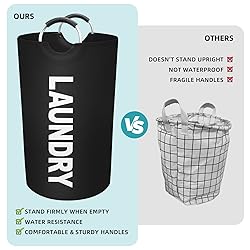 [Comfortable Handles] Laundry basket comes with sturdy aluminum handle ring which is protected by soft foam. The light weight ensures that the basket is easy to carry, even when full. The soft foam handles protect your hands so that you can easily carry the hamper anywhere, including the laundry room, bedroom, children's room, living room, etc. [Large Size] The laundry basket is 15"(L)x15"(W)x31"(H) with a capacity of 90L. Larger than most other laundry baskets on the market and can easily accommodate a variety of items you want to store, including dirty clothes, wet towels, pillows, quilts, etc. [Waterproof Inside] The laundry basket is made of double-layer fabric with waterproof PE coating inside, so it won't get moldy or smell bad from wet items. For daily cleaning, just use a damp towel to wipe gently. [Collapsible Storage] When you are not using the laundry basket, you can fold it up and store it in a drawer or closet to save space. For traveling, the hamper may be folded and put in luggage for easy use in hotels, camping, campuses, and shopping. [Freestanding Design] The bottom is reinforced with heavy-duty stitching The fabric and inner coating are made of premium fabric that can support freestanding even if it is empty. Keep your home tidy and organized.