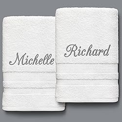 ⭐ LARGE SIZE - Set of 2 CUSTOM white Terry bath towels measuring 28" x 55" (72cm x 140cm), perfect for everyday use in your home or business. To create your perfect custom towel, Click on CUSTOMIZE NOW, type the name you want up to 12 characters (Letters and numbers). VERY IMPORTANT: Please check if the name you want is spelled correctly. Allow us 2 to 4 days to have your name drop embroidered and ready to ship. ⭐ QUICK DRY - The absorbent and quick-drying properties of these towels make them perfect for daily use in your bathroom, as they will help keep you dry and comfortable. Made from incredibly soft ring spun cotton with a two-ply construction for extra absorbency and fluffiness. 100% Cotton. ⭐ DURABLE - Beautiful double stitch detail adds a touch of elegance and ensures these towels will last through many wash cycles. Reliable and durable, these towels are perfect for use in your spa, gym, rentals, guest rooms, timeshares, bed & breakfast business or for luxury comfort in your own home. ⭐ OEKO-TEX Made in Green certified for peace of mind, ensuring these towels are ethically and sustainably made. ⭐ EASY CARE - Wash in cold or warm water before use, gentle cycle. Tumble dry low. Wash Dark colors separately from light colors. Avoid bleaches and any chlorine-based products, they attack the fabric dye. DO NOT use fabric softener because it may reduce absorbency. Pro Tip: Use 1/4 to 1/2 cup of white vinegar to replace fabric softener. To avoid stain marks, be careful with some Skincare and Acne products that may contain benzoyl peroxide. The ingredient acts like a bleach on textiles.