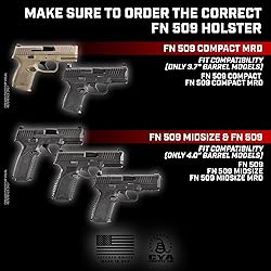 - This holster fits FN 509 Midsize & 509 Full Size (Red Dot Optic Compatible) Right Hand Draw Only. Will Not fit Light/Laser Picatinny Attachments. It is designed to be worn inside the waistband for concealed carry. CYA Supply Co. a member of NRA Business Alliance. We make our holsters with the end user in mind. We have put much attention to our materials, design and process to bring you a top-of-the-line holster at a better price. Finally, you do not have to sacrifice quality for a good price! We have taken the major wear and friction points out of this holster. In most kydex holsters, makers mold straight to the shape of the gun, this includes the slide release, safety etc. By recessing this area, we can create a smoother draw and re-holster. This also reduces the amount of holster wear on your gun. Our holsters are made from Boltaron thermoplastic, a similar plastic to Kydex. Boltaron is abrasion resistant, chemical resistant, and extremely durable. Boltaron outperforms Kydex, the material most thermoplastic holsters are made from, in impact resistance, hardness, and keeps its shape better than Kydex in high heat situations. The cant of the holster is adjustable from 0 to 15 degrees, simply use the Hex Allen Key that is provided with your holster to loosen the screw on the belt loop and adjust. The retention of the holster can also be adjusted with the Hex Allen Key, by adjusting the two screws placed in front of the trigger guard. Holster has a Positive audible click when inserting the handgun into holster, this is done by making our molds with a groove in the trigger guard. As stated above, CYA Supply Co is veteran owned, and our holsters are made right here in the USA. Great State of Texas to be exact. Thank you for supporting American made small business.