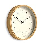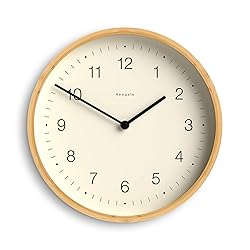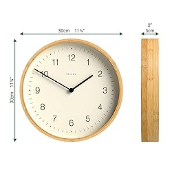 - Dimensions 30 x 30 x 5cm / 12 x 12 x 2in.. Designed and made exclusively by Newgate Clocks. Minimalist elegance, modern wall clock with a natural bamboo frame, offering a clean, understated design. Glass lens and metal hands. Cool and stylish, ideal for kitchens, living rooms and offices, where style matters. Accurate and reliable quartz silent sweep movement with no ticking noise. If your hearing is particularly sensitive in a completely silent room you may hear a very quiet whirring. Requires 1 x high quality branded alkaline AA battery (not included).
