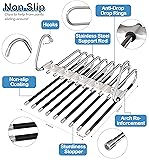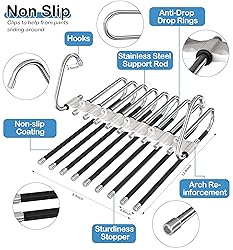 - 4 Pack Pants Hangers Space Saving, Upgrade 9 Layers Multifunctional Pants Rack Hanger Organizer Non Slip Jean Hangers with Hooks Stainless Steel Magic Clothes Closet Storage for Scarf Trousers Skirts Clean Up Closet Space! Keep your hangers neat and organized! About Product Specification Color : White Material: stainless steel + ABS Weight: 1.21 lb (single) Weight capacity : 33 lb Include: 4 pack space saving hangers for clothes 9 Layered Upgraded Hangers for Clothes Pants hanger has an S-shaped 9-tier design with 5 connect hooks on each hanger, allowing up to 9+5 pairs of pants to be hung on 1 clothes hanger at the same time. Also great for storing pants, scarves, ties, towels and other accessories. Helps keep your closet organized. Jeans Organizer for Closet Two Usage Modes Hangers for pants supports two types of hanging. Vertical mode: Saving more than 80% space for your closet. Horizontal mode: Convenient to pick up and place/dry clothes. You can choose the right hanging method for the trouser hanger according to your closet to help you make the most of your closet space. Non Slip Clothes Hangers Space Saving 18 pcs Balance Holder, Keep the jeans hangers space saving balance & Detachable. Each shirt hangers space saving have non-slip black plastic tube and anti slip caps on the ends to protect your clothes fall off. Strong Collapsible Hanger Organizer The pants hangers organizer made of stainless steel which is long-lasting and anti rust. Each shirt hanger can hold up to 20kg Assemble in Seconds Just put the rods through the holes and put the end pieces over the end of the rods.