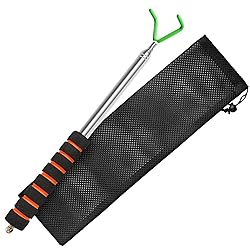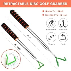 LIGHTWEIGHT & PORTABLE DESIGN: The multifunctional grip stick disc golf retriever pole weighs less than 0.3 kg,just fit all you need.With a funny storage bag.It's perfect for putting our disc golf grabber in. It's easy to carry to anywhere, easy to store, and fits in a backpack or hanging around the waist. STAINLESS-STEEL TELESCOPING ROD:The Disc Golf Retriever can collapses to 16 inch and extends up to 10ft.The disc golf retriever is made of thick stainless steel resistant to corrosion, and is sturdy and durable.Each section of the disc grabber is tightly connected, so the rod is stable and does not shake when used. NEVER LOSE DISC AGAIN:The disc golf retriever pole can be used in water, mud, grass, brush, trees, rocks and uneven terrain, disc retriever allows you to grab discs comfortably by the rim or hook head without harming your disc.This is definitely quick and easy to use, along with modest portability and above average durability. Non-Slip Sponge Handle and Rubber: Coated Metal Hook-- The handle is covered with thick sponge material to avoid slipping when using the tool and make it feel more comfortable. Double hooks are available. Each tip is coated with a protective rubber layer to provide maximum grip without scratching your disc. Perfect Gift:Our disc golf retriever stick not only equipped with an exquisite mesh storage bag, but also easy to carrying in a backpack or hanging around your waist. It is the ideal golf gift for your grandfather, father, husband or boyfriend.