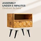 HANDCRAFTED GEOMETRIC DETAILS: Elevate your space with exquisite handcrafted geometric patterns that seamlessly blend modern and rustic beauty; Come with sleek black metal legs, our solid wood nightstand adds a touch of mid-century style to your home CRAFTED FROM REFINED MATERIAL: The nightstand with drawers has a beautiful walnut finish with natural wood grain; This accent nightstand promotes a sturdy structure with metal legs and adjustable levelers for durability and stability ASSEMBLY UNDER 5 MINUTES: With clear manuals and necessary hardware included in one carton box, our end tables living room can be assembled in under 5 minutes; Our rustic nightstand comes 90% pre-assembled, simply attach four legs to use it AMPLE STORAGE SPACE: Measuring an ideal 22 1/16 x 15 3/4 x 22 1/16 inches, our walnut nightstand offers versatile storage options; This rustic side table features an open space for easy-to-access items and a concealed large drawer for your essentials CUSTOMERS SERVICE: The solid wood nightstand with drawers is offered with a 30 day return policy and a 1 year warranty; Our dedicated customer service team is available 24/7 to support your shopping experience