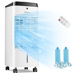 【Powerful Cooling with 2 Ice Packs】Keep cool all night long with a large 3.5L capacity water tank that requires no refilling. Plus, 2 included ice packs transform this fan into a powerful air cooler on hot days. 【4 Modes & 3 Wind Speeds】This evaporative air cooler features 4 customized modes- cooling, standard, natural and sleep & 3 wind speeds-low, medium and high. You can achieve better control of the room temperature and satisfy a variety of needs. 【Wide Coverage & Mobility】 The air cooling fan can manually adjust blades up and down within 70 degrees, which can evenly spread cool air flow to every corner of the room. And the 360°swivel wheels are also convenient for you to move the air cooler from room to room. 【Convenient & Quiet Operation】Enjoy quiet, uninterrupted use with low noise operation (No more than 63 dB). And a convenient remote control that allows you to adjust settings from the comfort of your sofa or bed (Max Distance:16.5 ft). 【Space-Saving & Cost-Saving】 With a 12-hour timer, the swamp cooler can automatically turn off the cooler when you're away to save energy and money. Also, 55W evaporative cooler is more efficient than expensive air conditioners.