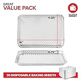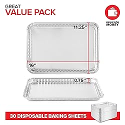 Baked to Perfection: Make the best ooey gooey chocolate chip cookies with our disposable cookie sheets. Our foil trays evenly bake your cookies to create that delicious golden crust. Heavy Duty: Made of premium quality aluminum construction, our large cookie tray is sturdy and durable. High gauge and full rim curl ensures that the pan won't break or rip while in use. Save Time: Conveniently freeze batches of dough in bulk using our aluminum cookie sheets. Then, pop into the oven when you’re ready to bake. The best part? No dishes! Just toss 'em in the trash. Multipurpose Pans: Our aluminum trays are great for baking a sheet cake, brownie tray, homemade pizza, and other delectable treats. They're also useful as a drip tray for catching grease, or messy arts & crafts projects. Great Value Pack: Includes 30 aluminum baking sheets . Measures approximately 16" Top Length x 11.25” Top Width x 0.75” Height.