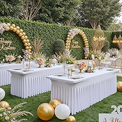 1. You will receive 2 Pack white wavy spandex table covers fitted for 6 foot rectangle tables. Manteles de mesa de tela para fiestas. 2. Made of Stretchy Spandex: Wrinkle Resistant; Quality Stitching; Washable; Ironable; Reusable. You can keep it for future events. 3. Fit for 6ft rectangle tables: Fitted table cover is good fit for a 72" Length x 30" Width x 30" Height table. No need to worry about the tablecloth blowing off or falling off. 4. Easy to slide on, and the spandex tablecloth covers the top and bottom of the table keeping it looking elegant. You can stash things under the table, keep supplies and back stock from being visible. 5. Adds elegance to 6ft tables: this stretchy table cloth with skirt shows pleats to make your table look fancier. 6. Multi-purpose table cloth / Manteles de mesa: Wrinkles free material makes the table clothes looks fantastic, perfect fit to decorate birthday party tables, wedding reception tables, craft event table, display table, banquet tables, trade vendor shows tables, baby shower, gender reveal, buffet table.