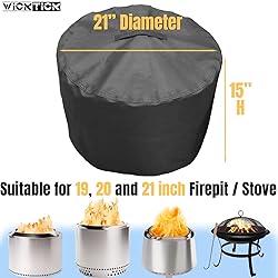 【 Special Size for 19" - 21" Stoves 】 Cover size is 21" Diameter x 15" Height. Compatible with 19.5" Solo Stove Bonfire 2.0 and other similar round fire pits up to 21 inch in diameter 【 Adaptability 】 Suitable for outdoor 17 / 18 / 19 / 19.5 / 20 / 21 inch Round Firepit Stoves, providing full protection at all seasons of the year 【 Heavy Duty 】 WICKTICK Round Fire Pit Covers are made of High-Class 600D Oxford fabric, heavy-weight and tear resistant, far better than ordinary 420D/210D covers 【 Waterproof 】 Lined with top-class PVC layer, WICKTICK fire pit / stove covers prevent rainwater from seeping into inside, which protects your bonfire stove from outside elements throughout all seasons 【 Windproof 】 The Drawstring at the hem could make the stove cover stay in place firmly, avoiding being blown away by winds 【 Further Protection 】 Dual-Stichings prevent the cover effectively from cracking at the stitches; Thermoplastic sealing stitchings inside prevents rainwater from permeating though the stitch holes 【 Easy to Use 】 The Solid Handle on the top make it easy to place and take off the cover, very convenient and effortlessly 【 Package 】 1 x Cover and 1 x Storage Bag (NOT include any fire pits)