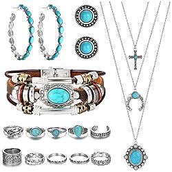 TURQUOISE JEWELRY SET: The western jewelry set includes 1 piece of layered turquoise pendant necklace, 2 Pairs turquoise earrings, 1 piece of turquoise leather bracelet and a set of boho knuckle rings.The rich combination for your daily wear and matching. BOHEMIAN JEWELRY: The boho turquoise jewelry set features the bohemian and retro style, and the turquoise shows deep, Power and warm meanings, Can bring you more chicness and charms. The detailed size has been explained in the picture,You can refer to it accordingly. MATERIAL: The western jewelry are made of turquoise,faux leather and environmentally friendly alloy, which is anti-allergic, Free of nickel, No rust, Corrosion and lasting color retention. Lightweight and not easy to fade or break, Can be worn for a long time! PERFECT GIFT: Bohemian turquoise jewelry set must be a wonderful gift for you, Wife, Friends,lover on Birthday, Anniversary, Holidays, Graduation, Christmas, Valentine's Day, Mother's Day and so on. Makes a sentimental surprise for your significant ones. AFTER-SALE SERVICE: If you are not satisfied with our western jewelry set , We will give you a satisfactory reply.