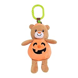 - Treat baby this Halloween with this engaging plush activity travel toy. The soft plush pumpkin bear comes with chime, and pull to jiggle features. The gentle chime sounds when shaken. Pull down the bear to feel it vibrate. The attached travel hook is perfect for a stroller, car seat, high chair and more. This toy promotes sensory development in newborns and infants. It is the perfect gift for fun at home or on the go.