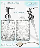 JASAI 2Pack Diamond Embossed Glass Soap Dispenser with 304 Rustproof Stainless Steel Pump, 12 OZ Bathroom soap Dispenser with A Wooden Tag, Elegant Hand Soap Dispenser for Bathroom & Kitchen