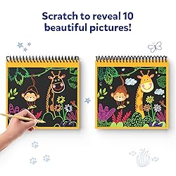 MAGICAL SCRATCH ART BOOK: Scratch over and make patterns to reveal colorful pictures, and create your own sticker art with animals found in the wild, on the farm, and underwater as you paste them on enchanting backdrops! INCLUDES: 10 scratch pictures, 30+ scratch stickers, 2 wooden styluses, and an instruction manual. HOW TO USE: Grab the wooden stylus and scratch away the black art paper to reveal a rainbow of colors underneath. Then, create your own scratch-art stickers on vibrant backdrops to add a personal, magical touch to your creations! TRAVEL-FRIENDLY: Includes a convenient holder for easy carrying, making it travel-ready. Perfect for long road trips, flights, and train rides, offering hours of fun on the go. CHILD-SAFE: Made with high-quality, odorless and non-toxic materials, this scratch art book is 100% safe for children to use. ENCOURAGES INDEPENDENT PLAY: Perfect for solo play, children can immerse themselves in creativity and unleash their artistic skills. DEVELOPS KEY SKILLS: Improves hand-eye coordination, creative expression, and bilateral hand coordination, while fostering creative thinking, fine motor skills, and spatial reasoning. SCREEN-FREE FUN: A great alternative to screen time! This scratch art book offers a creative way for kids to engage, learn, and have fun.