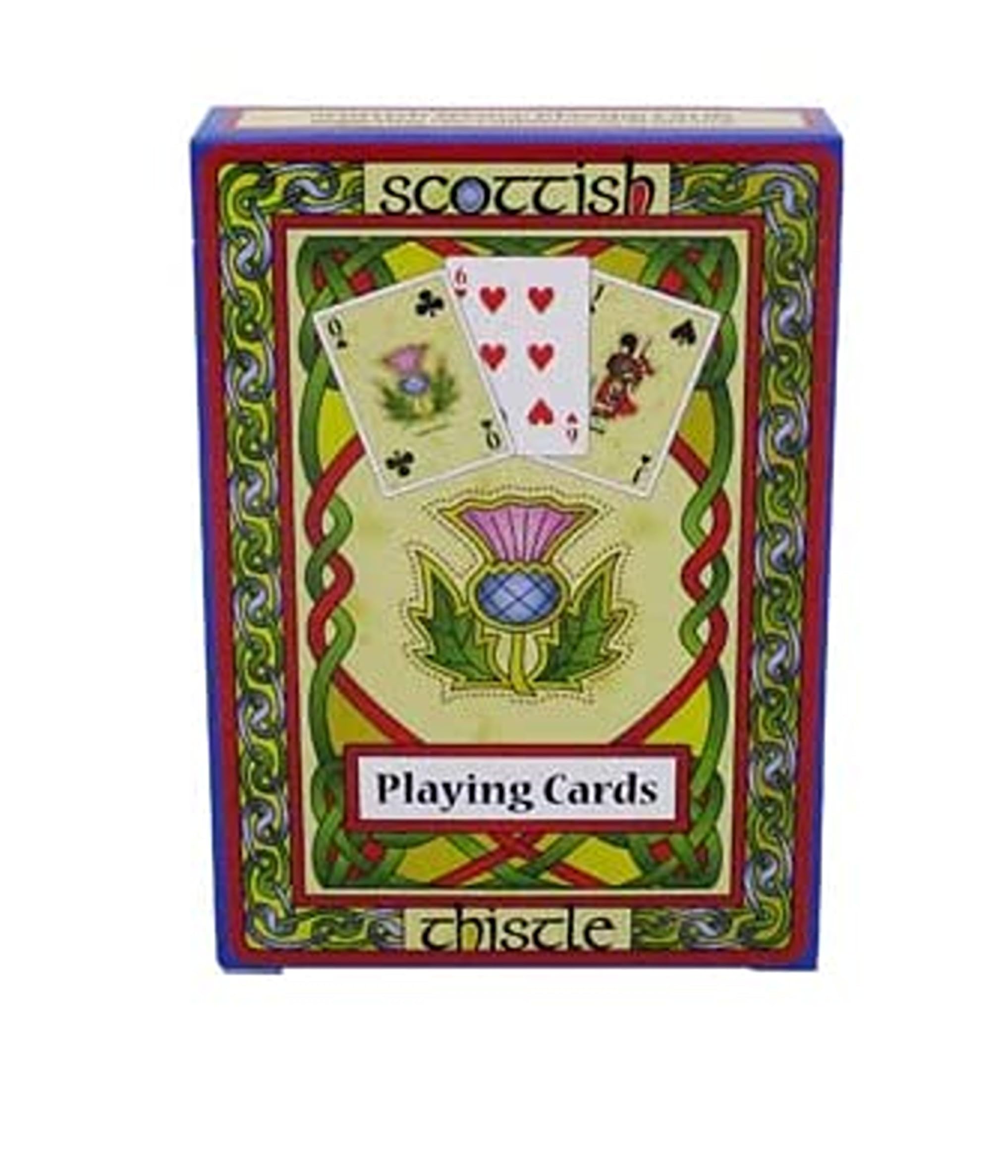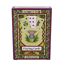 - Our Scottish Playing Cards are made of paper, a versatile and reusable material that can be recycled with little environmental impact. The package features a vividly colored design with a Scottish thistle that symbolizes steadiness, resilience, and strength. According to a legend, a sleeping party of Scots warriors was saved from ambush by an invading Norse army when one of the enemies trod on this spiky plant. The intricate knotwork is authentically inspired by medieval illuminated manuscripts. The set of cards measures 2.63 inches in width and 3.81 inches in height, being an interactive board game to play with your family and friends.