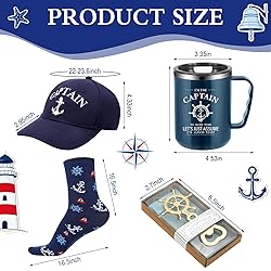 Boating Gifts for Men: you will receive 1 boating tumbler with lid, 1 boat captain cap, 1 pair of boat socks for men, 1 nautical beer opener, 4 pcs in all, they are practical and thoughtful gifts for men who love boating Insulated and Reusable Tumbler: measuring about 17 oz in capacity, made of quality stainless steel, the coffee tumbler for men is reliable and reusable, hard to break or deform, and the double wall design for better insulation can keep your drinks hot or cold for a long time, allowing you to enjoy your every sip Comfortable Wearing Experience: the captain cap has exquisite nautical themed embroidery design, simple and stylish, and there is a metal buckle at the back side, allowing you to adjust the cap to fit your head better, brining you a comfortable wearing experience Portable and Distinctive: made of metal alloy, the beer opener features the helm design, looking distinctive and cool, and it is portable and lightweight, can help you quickly and easily open your drink bottles Wise Gift Choice: the boating gifts for men are a wise gift choice to express your care and love to your father, male coworkers, and others, and they are widely applicable to various occasions, such as boating, camping, traveling, or other afternoon activities, going fishing on long afternoons