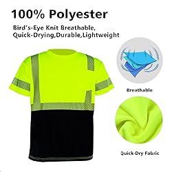 【Material】Vendace hi vis short sleeve shirt is constructed with comfortable fluorescent bird's- eye knit for a drier,100% polyester fabric,breathable,cooler moisture wicking experience. 【HIGH VISIBILITY】Safety shirts for men women short sleeve with 2 inch wide reflective silver strips around the waist and each sleeve ,it makes you be 360°visible when you are running or doing sports in dark snd safety.Black bottom design and pocket on left chest. 【COMPLIANCE & SAFETY】This reflective shirt short sleeve is in full compliance with ANSI/ISEA 107-2020 Class 2/Level 2 for all occupations and available in SIZE Small,Medium,Large,XL,2XL,3XL,4XL,5XL.The hi vis shirts for men and women. 【WIDE RANGE OF USING】The hi vis shirt is for construction workers, survey crews, surveyors, contractors, emergency responders, EMS, engineer, forestry, firefighter, police, crossing guard, public safety, security, traffic and parking attendants. Or for recreational activities such as: cycling, hunting / hunter, running, volunteering, jogging, bike, bicycle, motorcycle, and volunteering. 【Quality】Safety short sleeve shirt have top class quality and construction ensures wearability, comfort, safety and wear and tear.Machine Wash with Cold Water.