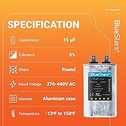 [UL Certified] BlueStars 15 uF MFD 370-440V Oval Run Start Capacitor CBB65 – Replacement for AC Motor, Condenser, and Heat Pump Air Conditioners - Replace TRCF15 PRCF15A CAP-15-450 - Pack of 2