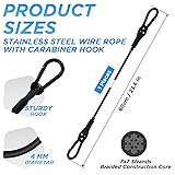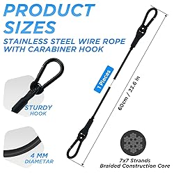 - Loop-end Security Wire Rope Cable with Carabiner Lock: 1. Tightly wound and strong bearing capacity. 2. Excellent rust resistance and oxidation resistance, can be used in various indoor and outdoor harsh environments. 3. PVC coating prevents scratches, and carabiner hook provides a convenient use. Wide Range of Use: Ideal for bikes, chain lock, helmets, boats, snowboards, outdoor travel, clothesline, transport, home decoration hanging and so on. Specification: Material: 304 Stainless steel wire rope Construction: Braided and PVC Coated Length: 24 inch/ 60 cm Thickness: 4 mm Cable: 304 Stainless steel 7x7 strands braided Loops: Aluminum sleeve crimped process Locks: 304 Stainless steel carabiner hooks Color: Black Package includes: 1 pcs pvc coated braided stainless steel loop end wire ropes with carabiner hook locks