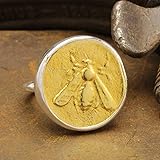 - Product Description This handcrafted 24K gold vermeil sterling silver Greek art ring features a reproduction bronze Ancient Greece Ephesus Tetradrachm Honey Bee coin. Hand hammered round ring band measures 2mm in width and 24K gold vermeil bronze coin bezel set ring head measures 21.5mm diameter. Details Stock number : RC03201026 Metal : Solid 925 Sterling Silver Color : Silver Stamp : 925 Finish : Hammered Band Width : 2mm Band Profile : Full Round Coin Color : 24K Yellow Gold Vermeil over Bronze Coin Coin Bezel Setting Measurements : 21.5mm diameter Ring Weight : 10,50 grams (approximate weight for size US 6) Ring Size : Made to order in whole, half and quarter sizes Coin : Reproduction Coin Coin Material : Bronze Coin Shape : Round