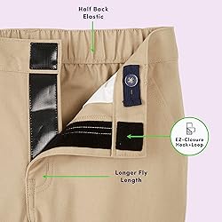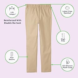 - Designed with thoughtful adaptive features, the French Toast Girls Adaptive Straight Leg Stretch Twill Pant makes dressing easier while offering a polished look perfect for school and beyond. Crafted from a soft cotton-blend stretch twill, these pants move with her and stay comfortable all day. Reinforced lift loops at the waistband support independent dressing or caregiver assistance, while the outer leg placket opens with a hook-and-loop closure to allow quick changes or medical access without removing the pants entirely. Flat seams and a tag-free interior offer irritation-free wear, making these pants ideal for children with sensory sensitivities. The adjustable waistband ensures the perfect fit, and front slash pockets provide convenient storage for small items like keys or fidgets. Whether she's headed to class, therapy, or a family outing, these straight leg uniform pants are built for comfort, confidence, and inclusion—part of the French Toast Adaptive collection where every detail makes a difference.