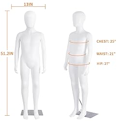 - Product Description: You can use the mannequin as an everyday outfit aid and place it indoors, outdoors or in the patio for a more refined look! Show off your best fashion outfits with this plastic mannequin. It is perfect for all sophisticated clothing stores and studios. Its real pose accurately mimics the stylish appearance of a modern real person. Can bring more customers to sell more children's clothing. Don't hesitate, buy it now! WHY CHOOSE SHAREWIN 51.2" Children Mannequin: 1. Professional - We have been focusing on producing mannequin torso for many years, providing every customer with the most valuable products with high quality. 2. Customer Service----If you have any questions, please feel free to contact us, we will get back to you within 24 hours. Feature: Rectangular iron base and durable aluminum base with high-quality PP body to ensure the stability of the whole body. Detachable arms make dressing and undressing very easy. Unbreakable and durable, every process is carefully crafted, and it works better with fashionable clothing. Product Specifications: Material: plastic + metal base Height: 51.2 inches Bust: 25 inches Waist: 21 inches Hips: 27 inches