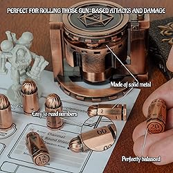 UNIQUE BULLET-SHAPED DESIGN - Our Bullet Shaped Polyhedral Dice Set is a must-have for a gunslinger character in your next campaign. The dnd dice set includes 7 dice that are shaped like bullets, providing a unique and stylish addition to your gaming accessories. Plus, they can also be used as handy ammo counters to keep track during combat encounters. SPINNING REVOLVER CYLINDER DICE CONTAINER - Comes with a Spinning Revolver Cylinder Dice Case that is not only cool but also practical for storing your dice. This dice box also doubles as a fidget toy for D&D players, perfect for keeping your hands busy during lulls in gameplay or virtual meetings. SOLID METAL AND EASY TO ROLL - Our role playing dice set are made of solid metal, giving them a heft in the hand and a satisfying thud when rolled. Perfect for rolling those gun-based attacks and damage. It is perfectly balanced when rolling them, and the numbers are easy to read. Enjoy the shooting guys!! VERSATILE SET OF 7 POLYHEDRAL DICE - Our unique dice set includes a full range of 7 polyhedral dice, including a D20, D12, D10, D%, D8, D6, and D4. Perfect for games like wargames, tabletop role playing games, Cyberpunk, card games or board games. PERFECT GIFT FOR GAMERS AND GUN ENTHUSIASTS - Not just for gun enthusiasts, our Bullet Dice Set makes a unique and cool addition to any gamer's collection. Perfect as a gift for a gunslinger player, dice collectors, or any craps player. Upgrade your game today with our CZYY Bullet Dice Set and take aim at your next adventure!