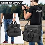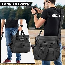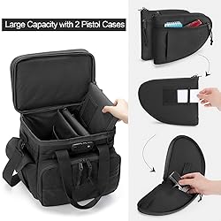 Multi Pockets: Tactical pistol range bag holds up to 3 handguns, including a gun bag on the top and 2 extra pistol cases. Front zip pocket holds 12x magazines. One elastic pouch for water bottle, another side flap pocket and top cover pocket for flashlight or cleaning kit Upgrade Security: The pistol duffle carry bag is equipped with a TSA customs lock on firearm compartment, and also features two-ways lockable zipper for mag compartment to maximize your safety concern. Ideal for shooting range or hunting expedition Well-designed: Large main compartment features detachable inner divider and 3 pocket to organize room for earmuffs, ammo, shooting glasses, and other essential gear for the range. Front patch area is designed for the morale funny patch Convenient Designed: Easy-to-carry handle and adjustable padded shoulder straps enhances comfort and convenience to carry.The back ID card window makes it easy to find your handgun case Premium Quality: The range bag is made of heavy-duty nylon material with all-round padded lining to secure your valuable firearms and accessories during transportation.The reinforced sewn at all strength points are built to last. Dimensions: L:11.8 x W:7.5 x H:12.8 inches